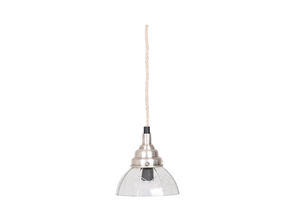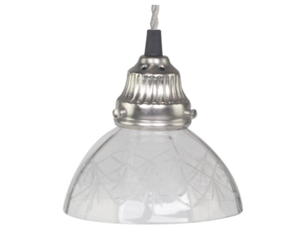 Skleněný lustr na zavěšení ruční výroby s vrytými ornamenty vhodný do rustikálního interiéru, vhodný nad kuchyňskou linku. Průměr je 13cm, součástí balení je kabel o délce 1,5m včetně zakončení u stropu. Doporučená žárovka o 40W, zásuvka E14, vrchní část lustru je kovová.