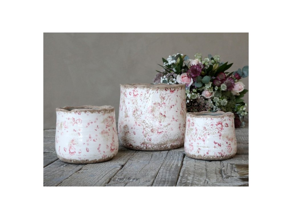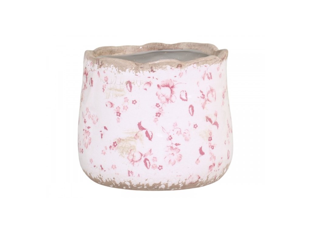 Květináč z řady Cannes v krémové barvě s jemnými růžovými květy, vintage styl. Rozměry: výška 12cm, průměr 13cm.