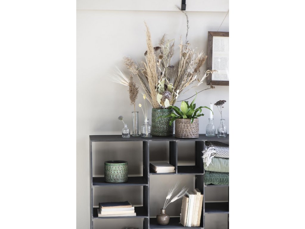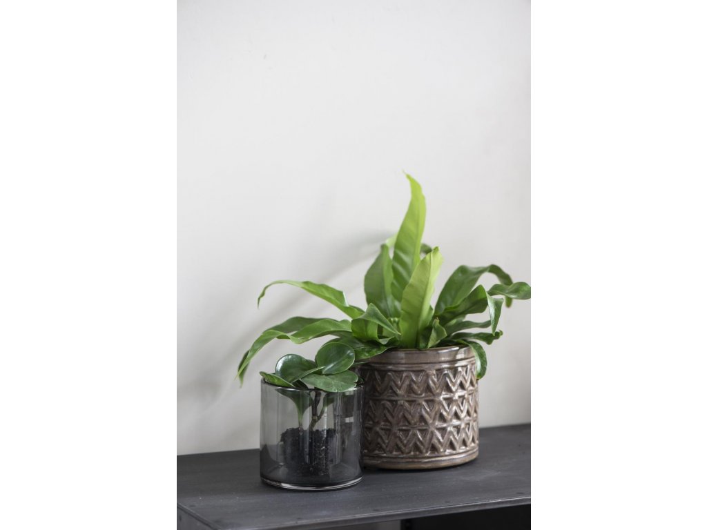 Keramický květináč se vzorem zig-zag v barvě zemitě hnědé. Rozměry: výška 12cm, průměr 14cm.