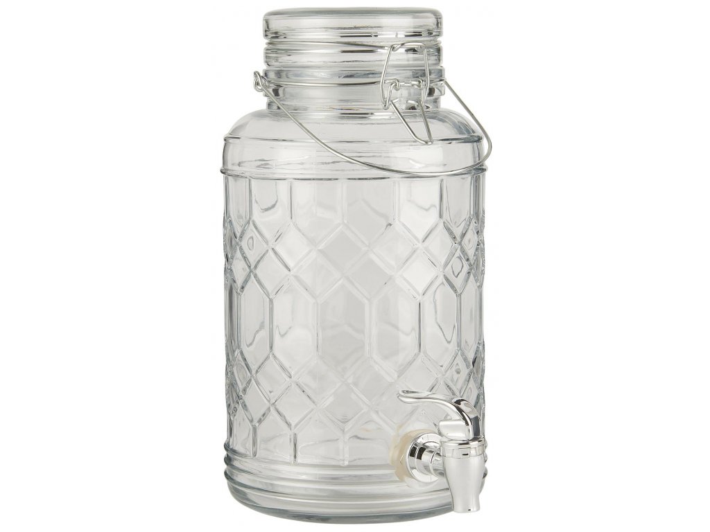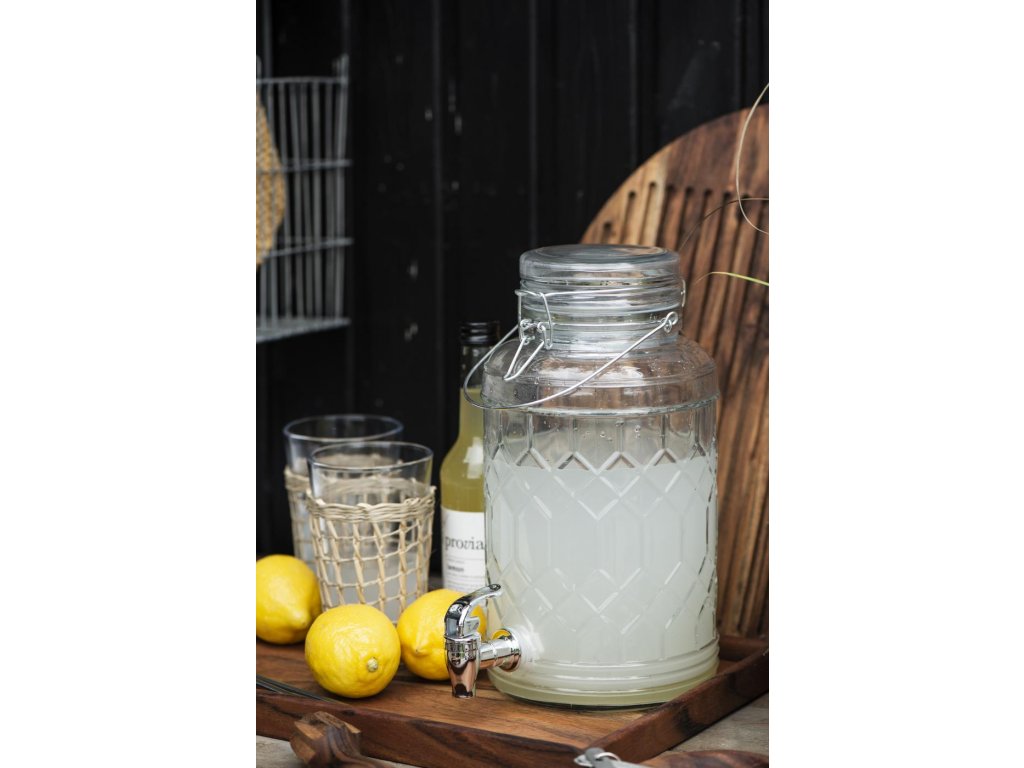 Skleněný zásobník na limonádu, vrchní otvor je dostatečně široký pro přidání ovoce, objem 3,5l; rozměry : výška 30cm, šířka 30cm