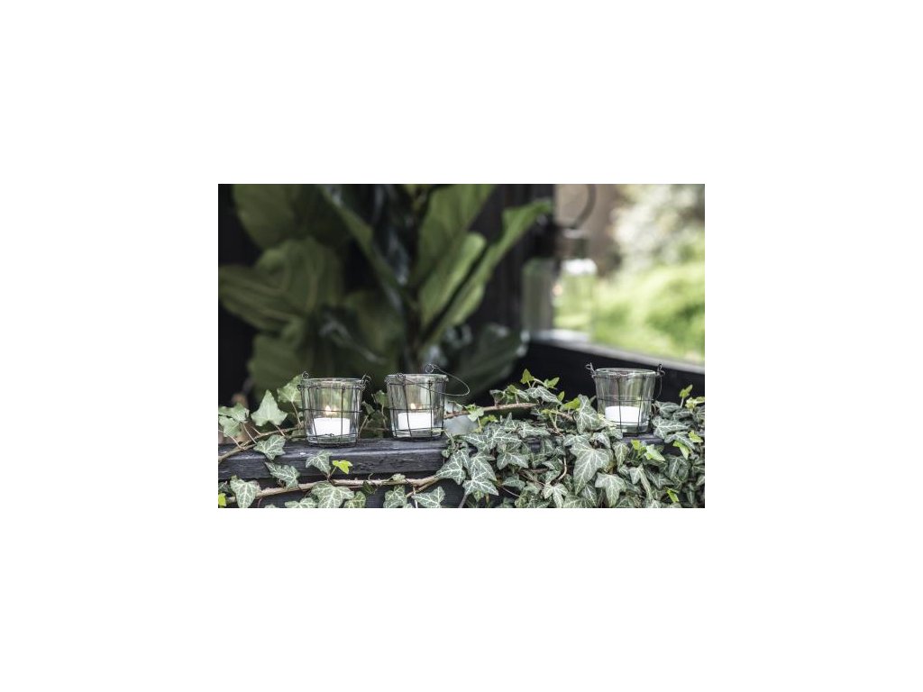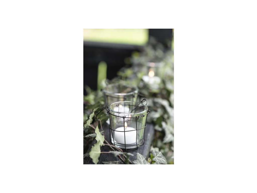Malý skleněný svícen v kovovém košíku, výška 6,3cm, průměr 6cm. Krásný doplněk pro stůl, nebo terasy. Svícen je vhodný pro čajové svíčky.